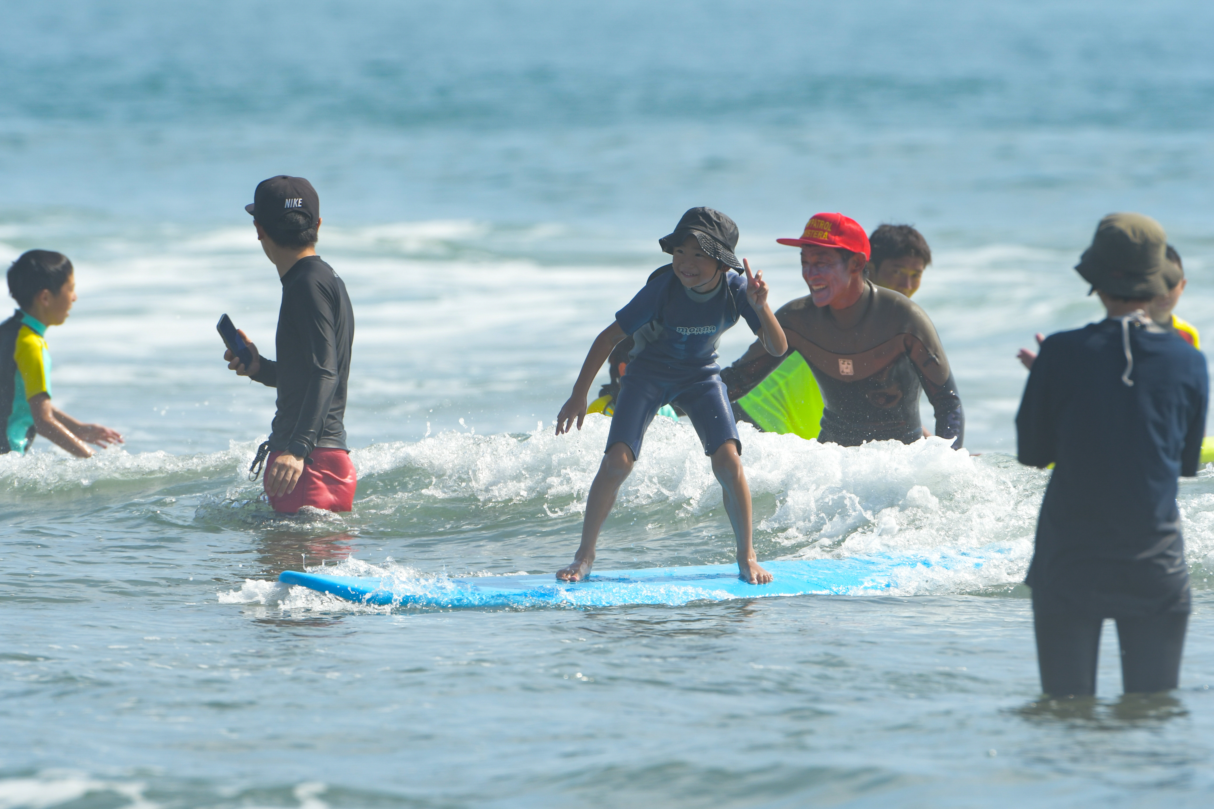 毎年好評の初心者向け体験会。地元のローカルサーファーやライフセーバーがインストラクターを務め、小・中学生の参加者に安全で楽しいサーフィンを提供します。