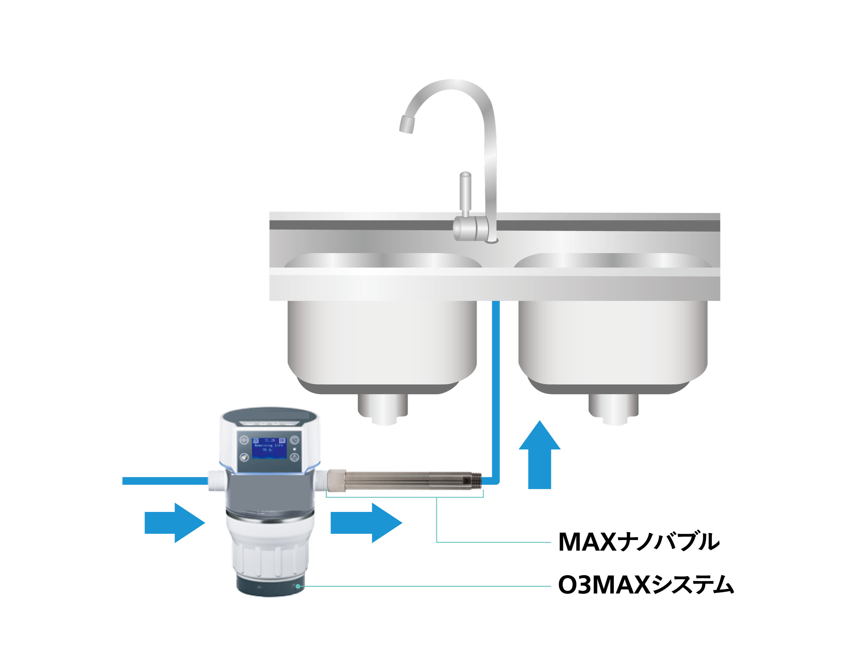 同社製の「O3MAX Water System(オゾンマックスウォーターシステム)」と「MAX ナノバブル(マックスナノバブル)」を組み合わせた「O3MAX Water System+MAX ナノバブル」は、高純度オゾンによる「除菌・消臭」とナノバブルによる「洗浄」のトリプル効果により、衛生環境の向上と作業の効率化が期待できます。食品工場や飲食店をはじめ、美容や医療、教育施設など幅広い業界で活用いただけるシステムです。