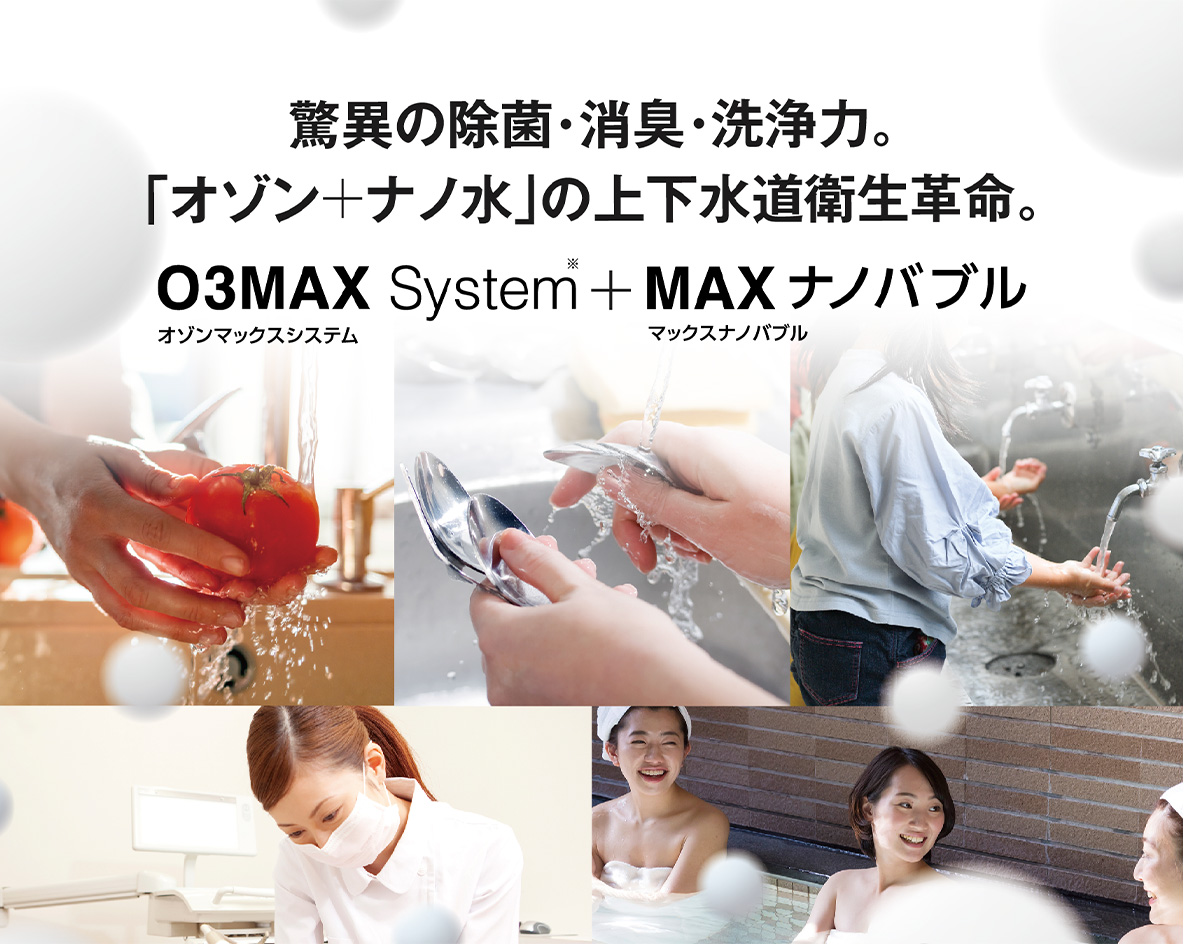 同社製の「O3MAX Water System(オゾンマックスウォーターシステム)」と「MAX ナノバブル(マックスナノバブル)」を組み合わせた「O3MAX Water System+MAX ナノバブル」は、高純度オゾンによる「除菌・消臭」とナノバブルによる「洗浄」のトリプル効果により、衛生環境の向上と作業の効率化が期待できます。食品工場や飲食店をはじめ、美容や医療、教育施設など幅広い業界で活用いただけるシステムです。