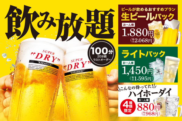 生ビールパック・ライトパックなど、ニーズに合わせた飲み放題も追加オプションで楽しめます。