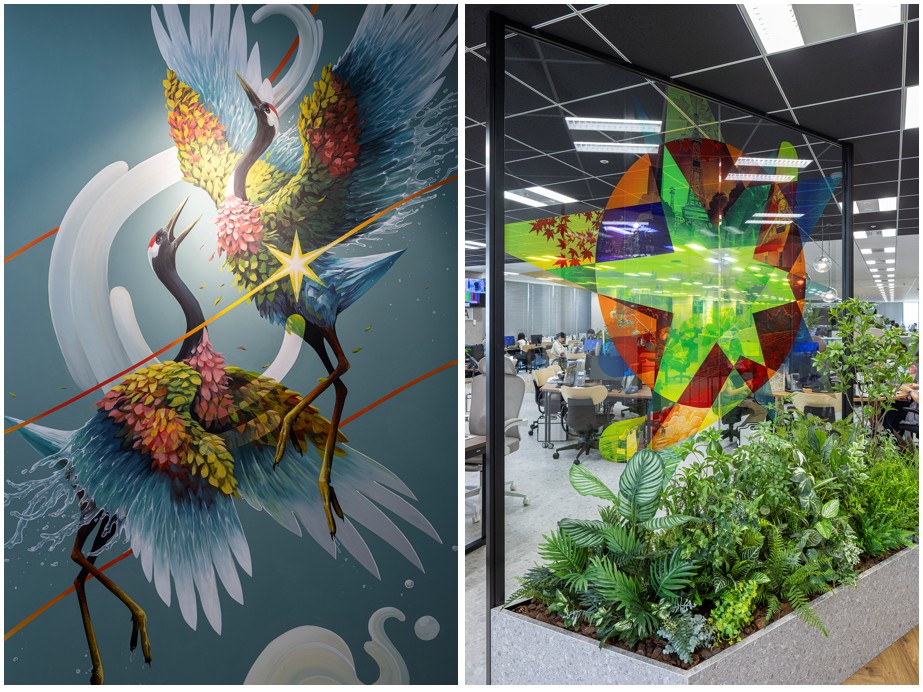執務室は単調さをなくすため、回遊性を高めたレイアウトを採用しました 。これにより、 新たにグループ会社となった「ゆこゆこ」の従業員とジャパネットの既存従業員が、自然に交流・議論し、チームワークを創出できる開放的な空間となっています。 また、エントランスや執務室には、『札幌の地と「ゆこゆこ」と「ジャパネット」の融合』を表現した大型アートを設置 。このアートに込めた想いを社内で共有し、組織の一体感を醸成しています。