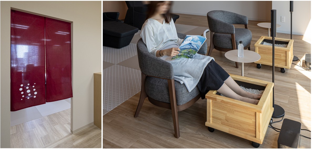 シエスタルーム:最大のこだわりは、ほっと一息つける「温泉宿」をイメージした休憩室です 。温泉宿泊予約サービス「ゆこゆこ」の雰囲気を感じられるよう、入り口に暖簾を掛け、畳を模したフロアで靴を脱いでリラックスできる環境を整えました 。リクライニングチェアに加えて「濡れない足湯」も完備しており 、従業員から「まさか休憩で足湯ができるとは」と驚きの声が上がるほど、完璧なオンとオフの切り替え(メリハリ)を実現しています。