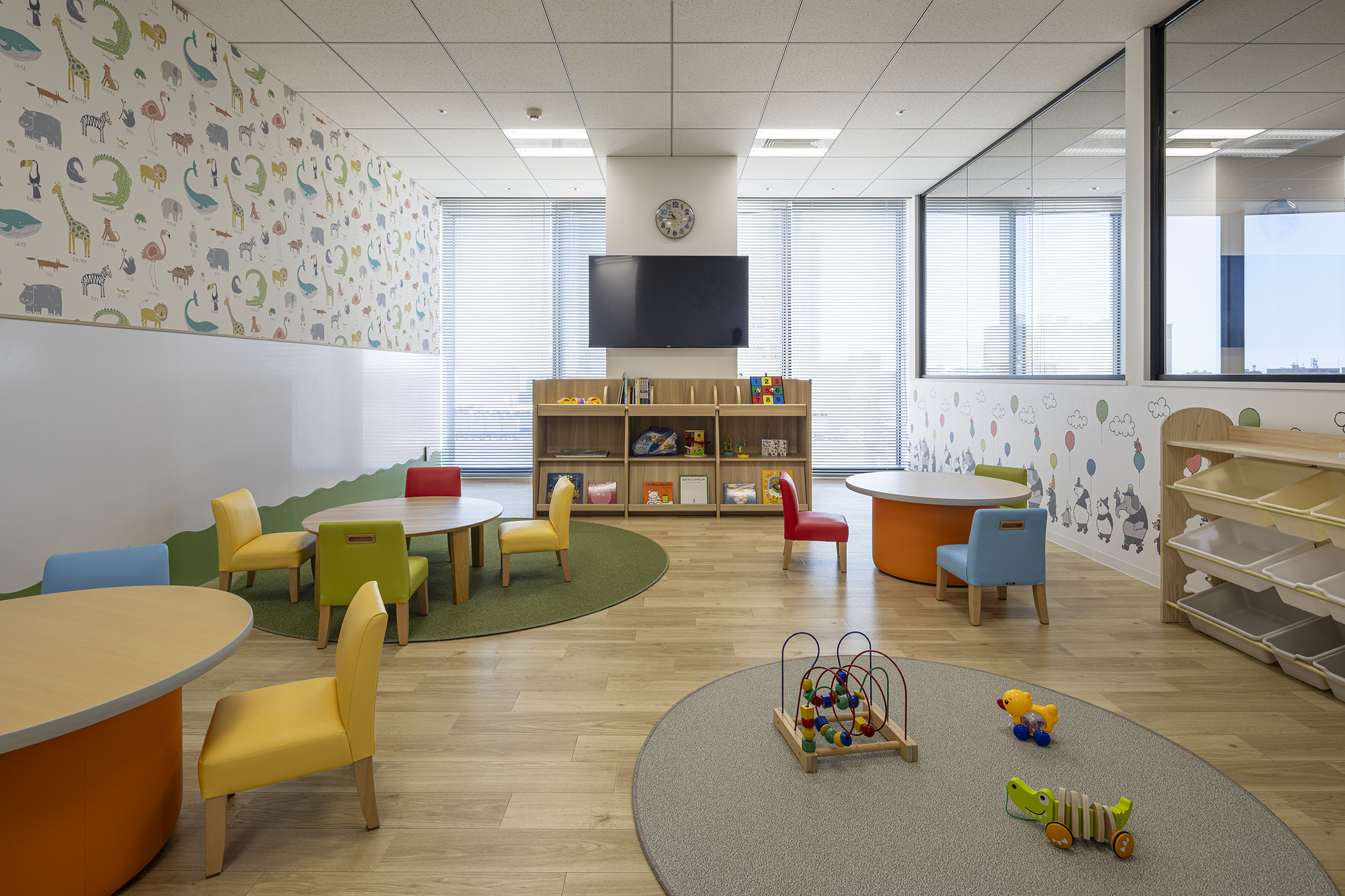 「預けたくなる託児所」:従業員の多くを占める主婦層が安心して働けるよう、子育てと仕事の両立を支援する託児所を完備しています。明るい日差しが差し込み、街の景色が望める保育環境。休憩室からお子さまの様子を確認できる大きなガラス窓を採用しています。